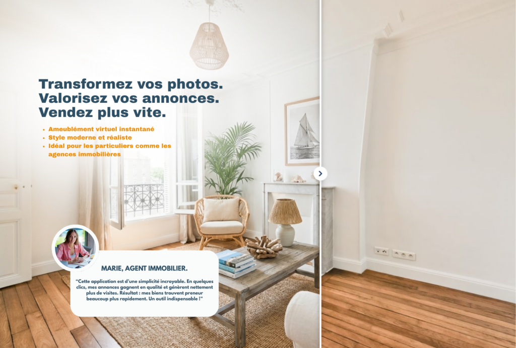 Visio Immo is a virtual home-staging app that transforms empty or outdated property photos into beautifully furnished spaces in seconds. Users simply upload a photo, choose a style, and instantly receive a realistic, high-quality rendering that boosts listing appeal, increases visits, and accelerates sales. Perfect for both homeowners and real estate agencies.